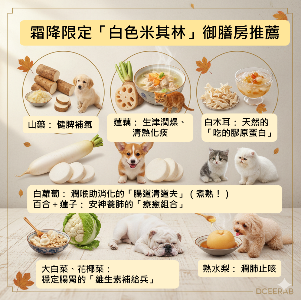 中獸醫太傅有云:「冬令暴力進補,不如霜降溫柔巧補!」此乃調理龍體、潤燥養肺、為過冬儲備戰力的黃金時刻。各位鏟屎臣子們,接旨吧!