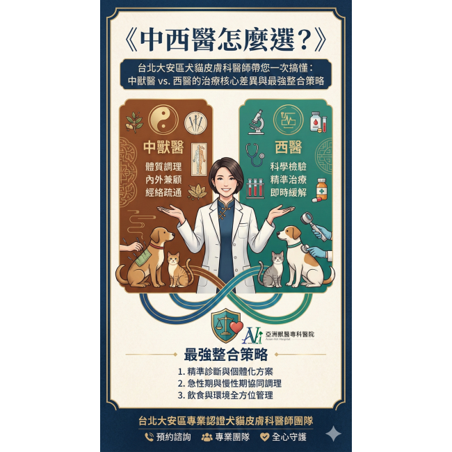 標籤: 《中西醫怎麼選?》台北大安區犬貓皮膚科醫師帶你一次搞懂:中獸醫 vs. 西醫的治療核心差異與最強整合策略