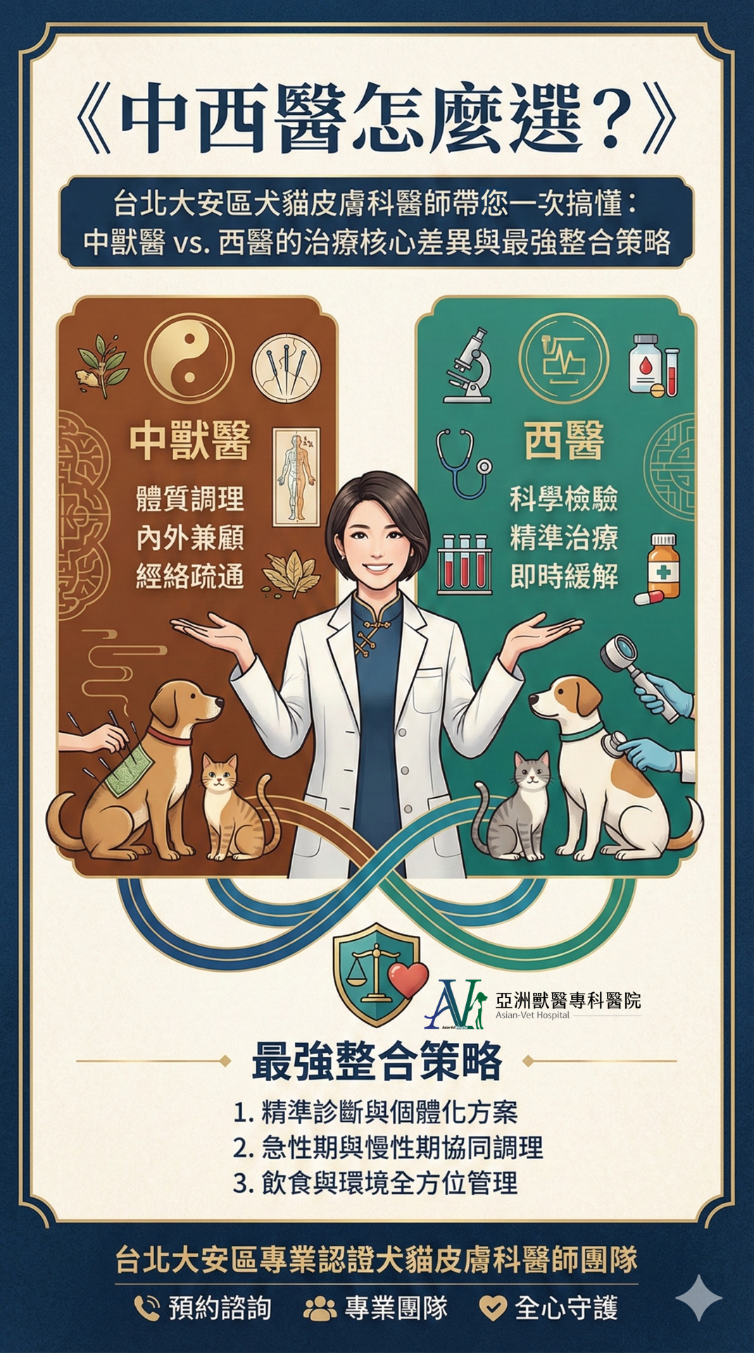 在『亞洲獸醫專科醫院』中,我們從不單純建議「該選中醫或西醫」,而是依據毛孩的臨床狀況綜合評估: