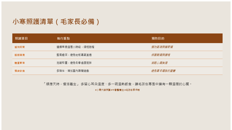 - 穿衣哲學: 短毛、老幼犬貓建議穿上保暖衣物,但嚴禁 24 小時穿著。每天需脫下讓皮膚透氣並梳毛,避免悶出濕疹或皮膚病。