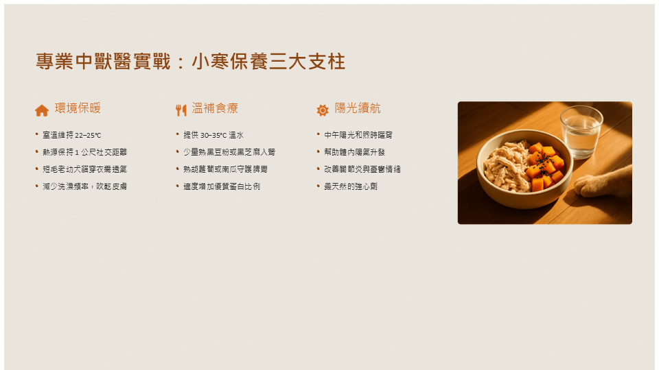 想要讓毛寶貝安穩過冬,您必須掌握中獸醫核心精髓:「養腎、護胃、抗寒邪」。