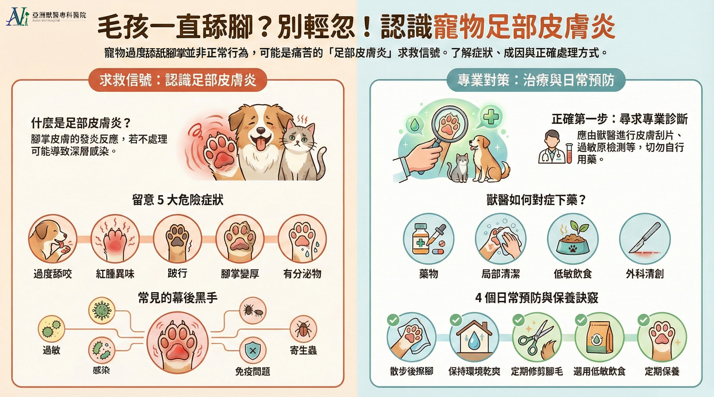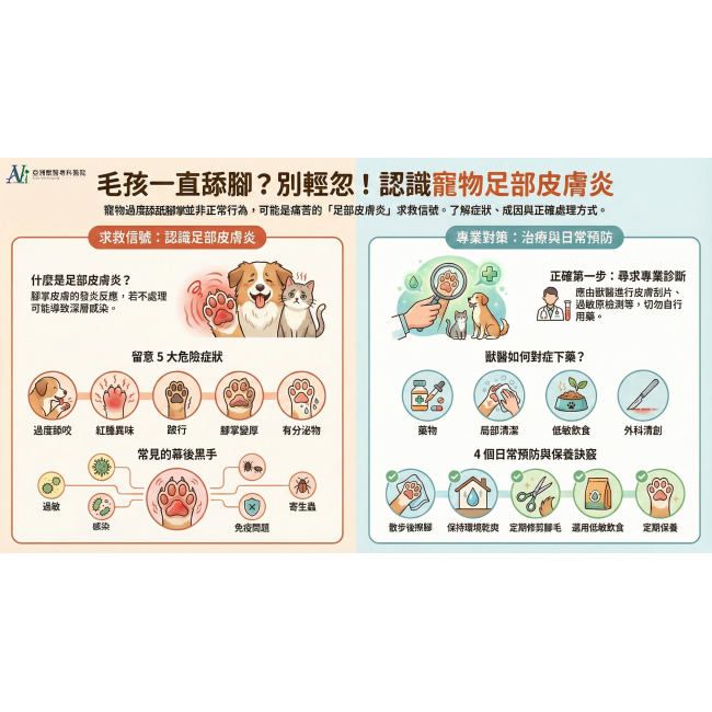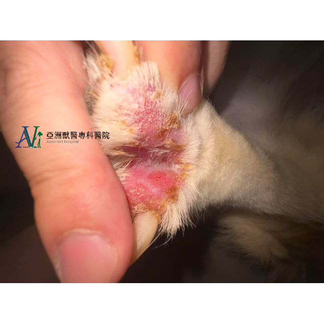 在我們皮膚科獸醫眼中,狗貓過度舔腳、紅腫滲液、甚至腳掌變厚結痂,往往都是「足部皮膚炎(Pododermatitis)」在作怪。這是一種腳掌皮膚的發炎反應,成因超多,像是: