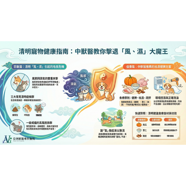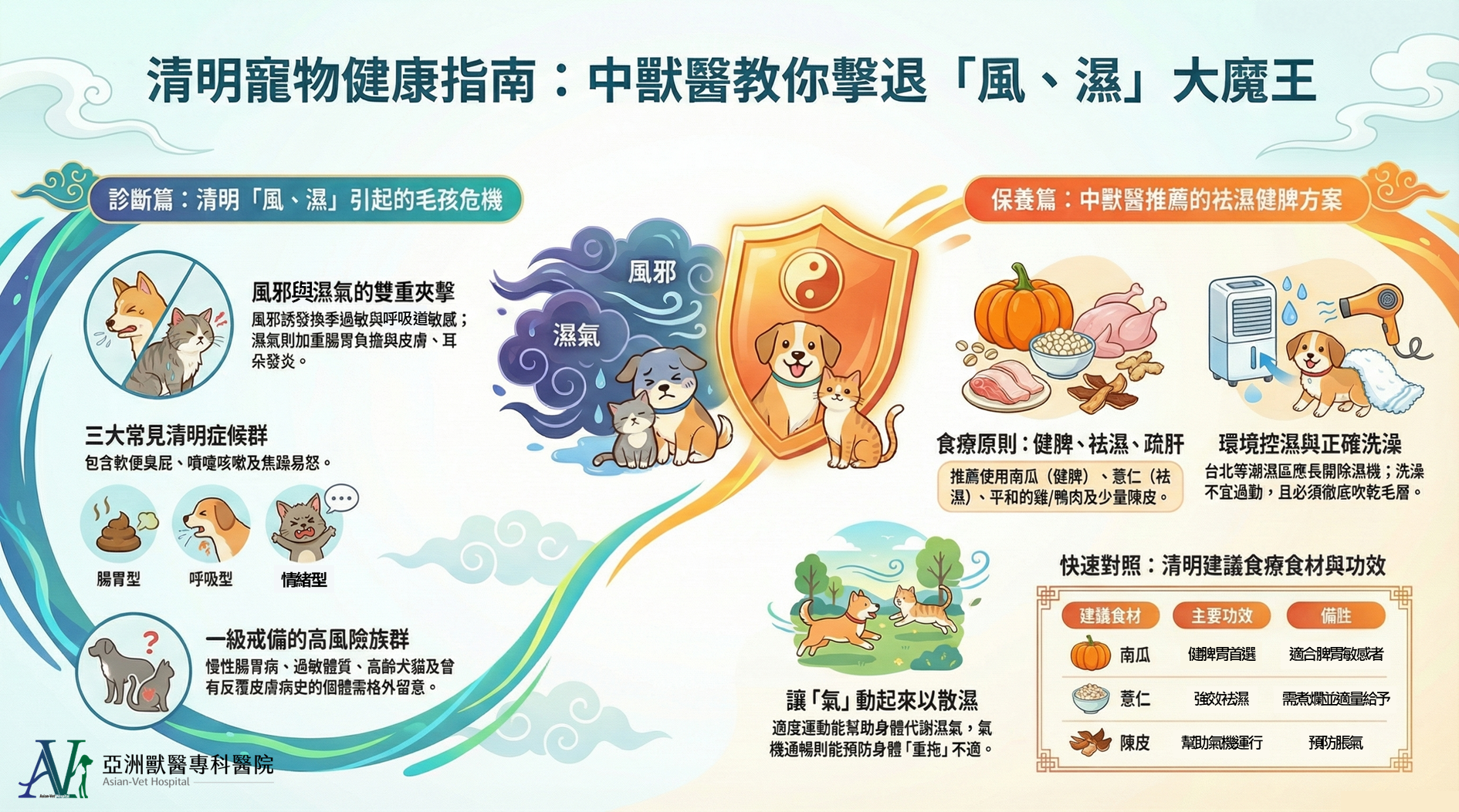 清明時節雨紛紛,家長忙著掃墓,毛孩則在忙著「身體大掃除」。在中獸醫(TCVM)的觀點裡,清明正處於春氣升發、濕氣漸重的關鍵節點。這時候如果調理不好,毛孩很容易從「健康小天使」直接跳台變成醫院的「 VIP 門診常客」。