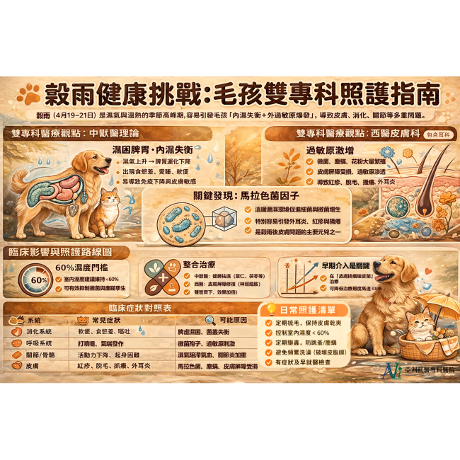 「穀雨」,是春天最後一個節氣,約落在每年4月19至21日。古人說「雨生百穀」,這場雨滋養了農作,卻也悄悄為您家的貓主子與汪星人帶來一波身體考驗。身為整天與毛孩的皮膚、腸胃、關節打交道的雙專科醫師,每年穀雨前後的診間總是特別「熱鬧」——熱鬧得讓人懷疑這些毛孩是不是集體看了節氣日曆才決定一起來報到。