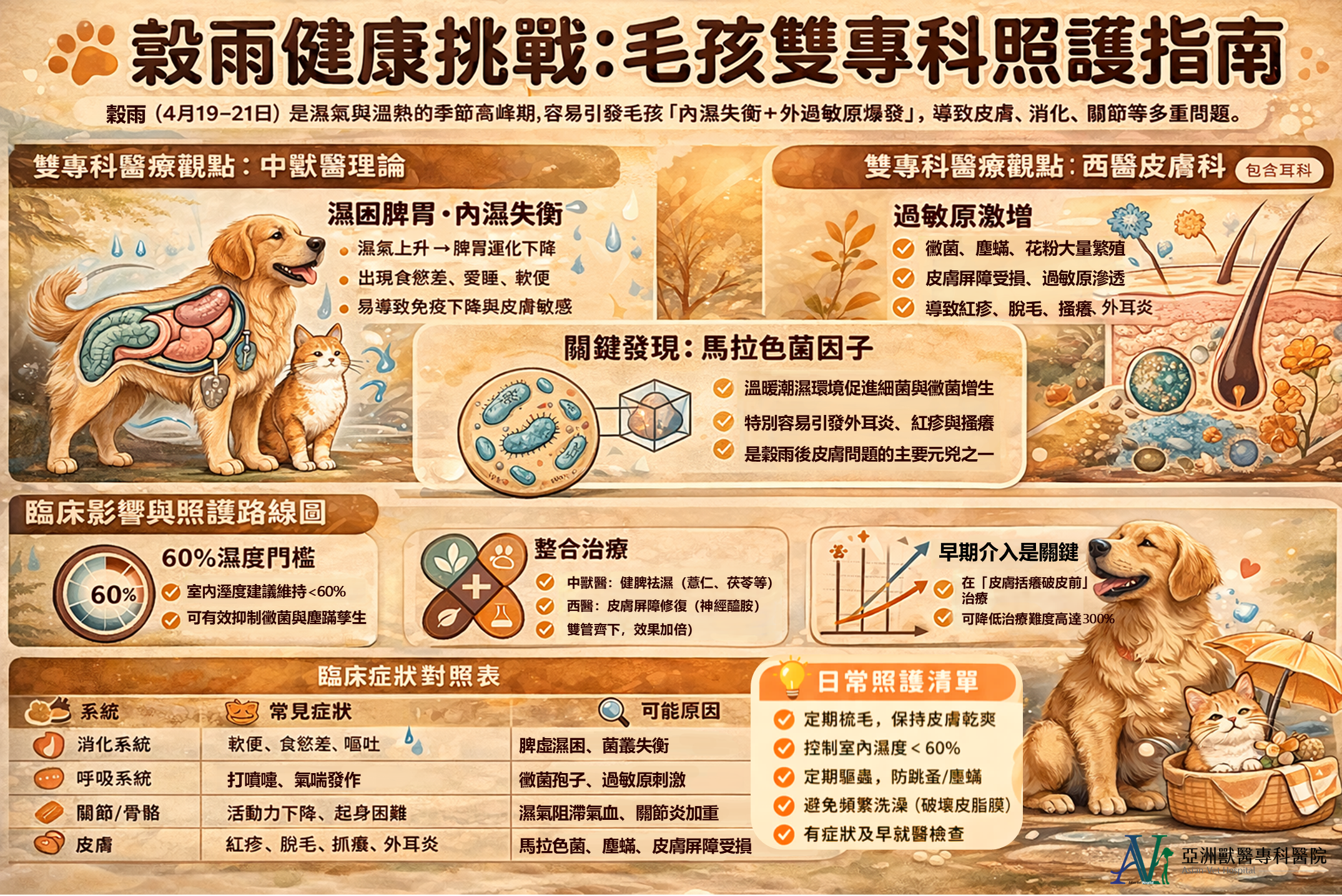 最後,身為兼具中西醫訓練的獸醫師,給飼主的穀雨實用建議是:定期梳毛(降低皮膚悶熱與感染機率)、保持環境除濕(相對濕度建議控制在60%以下)、按時做好體外寄生蟲防治(跳蚤與蟎蟲在此時節如魚得水),以及——最重要的——別等毛孩「癢到地板都刮破了」才來看診,早期介入治療效果遠優於晚期。