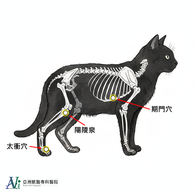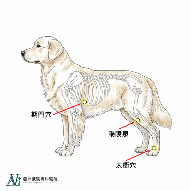 • 功用: 肝主筋。此穴能幫助全身筋脈放鬆,對春天容易緊繃、關節卡卡的毛孩有奇效。